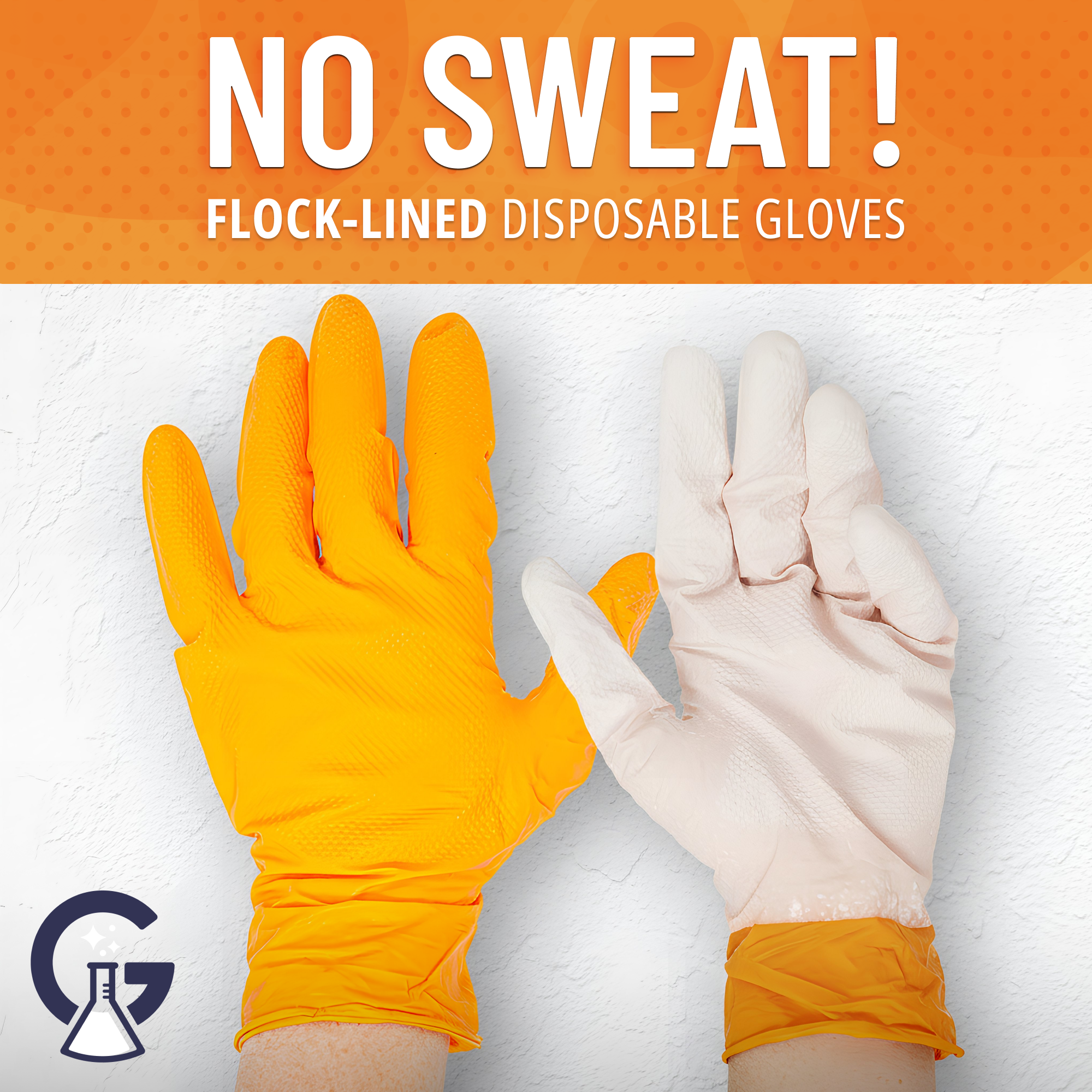 No Sweat! Orange Gloves are next-generation disposable nitrile gloves designed for serious protection without sacrificing comfort. The soft flock lining helps prevent sweaty hands during long jobs — a rare feature in disposable gloves.