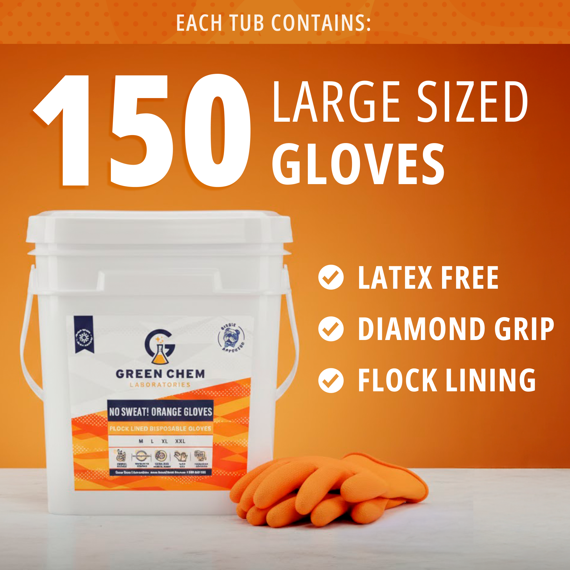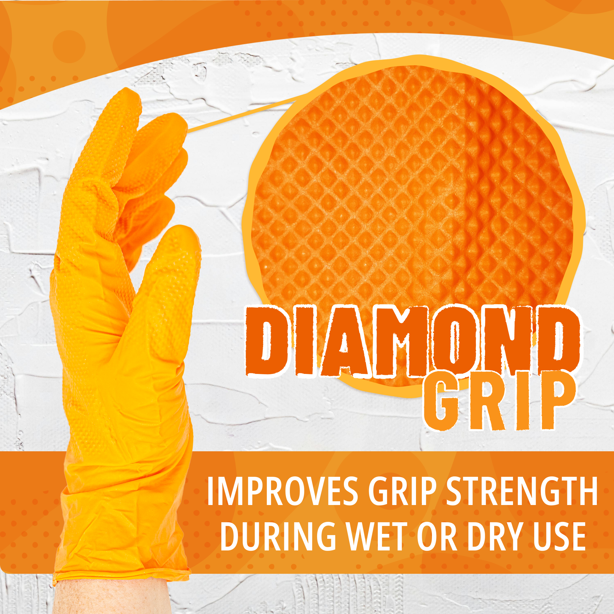 A raised diamond texture provides a secure grip, even on oily surfaces, and the bright orange color improves visibility on the job. When regular disposable gloves fall short, No Sweat! Orange Gloves deliver the performance you need.